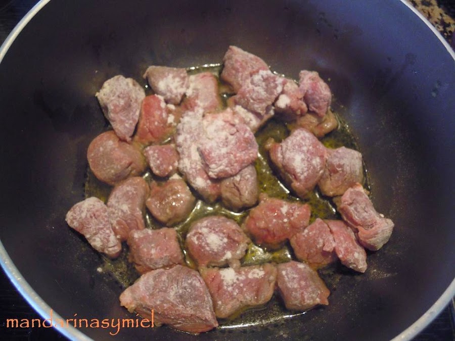 Salpimenta la carne y rebózala por la harina, sacúdela y ponla en la cazuela con el aceite caliente, remueve.