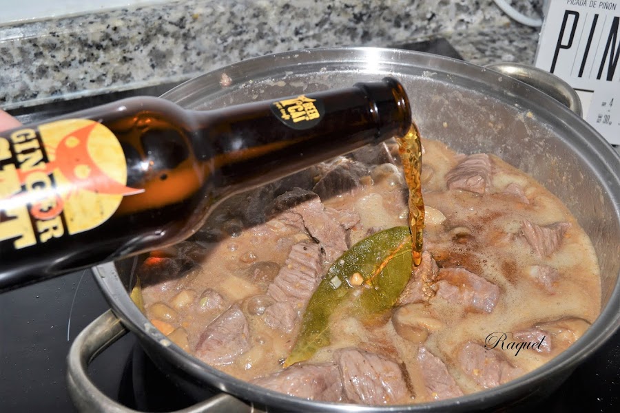 Esta receta la prepare el otro día sin pensarla, lo que iban a ser unas patatas guisadas con carne de ternera se convirtió en este plato, porque resulta que buscando en la despensa una picada de piñón que tenia guardada, vi un bote de setas, unas cuantas cervezas, de esas especiales que guardo par recetas especiales, escogí esta que puse en la receta y una cosa llevo a la otra.