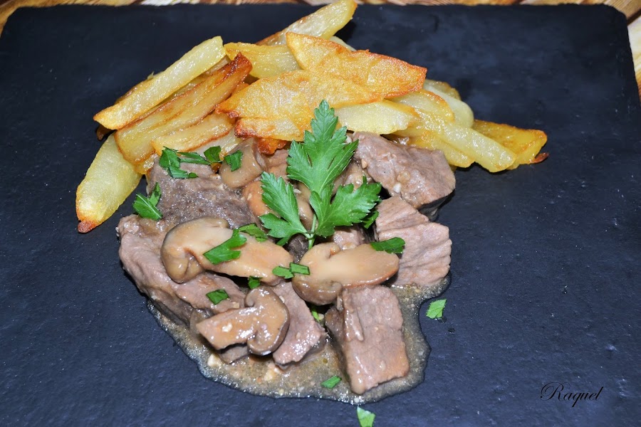 Solo queda freír unas patatas para acompañar esta rica carne guisada con setas a la cerveza.
