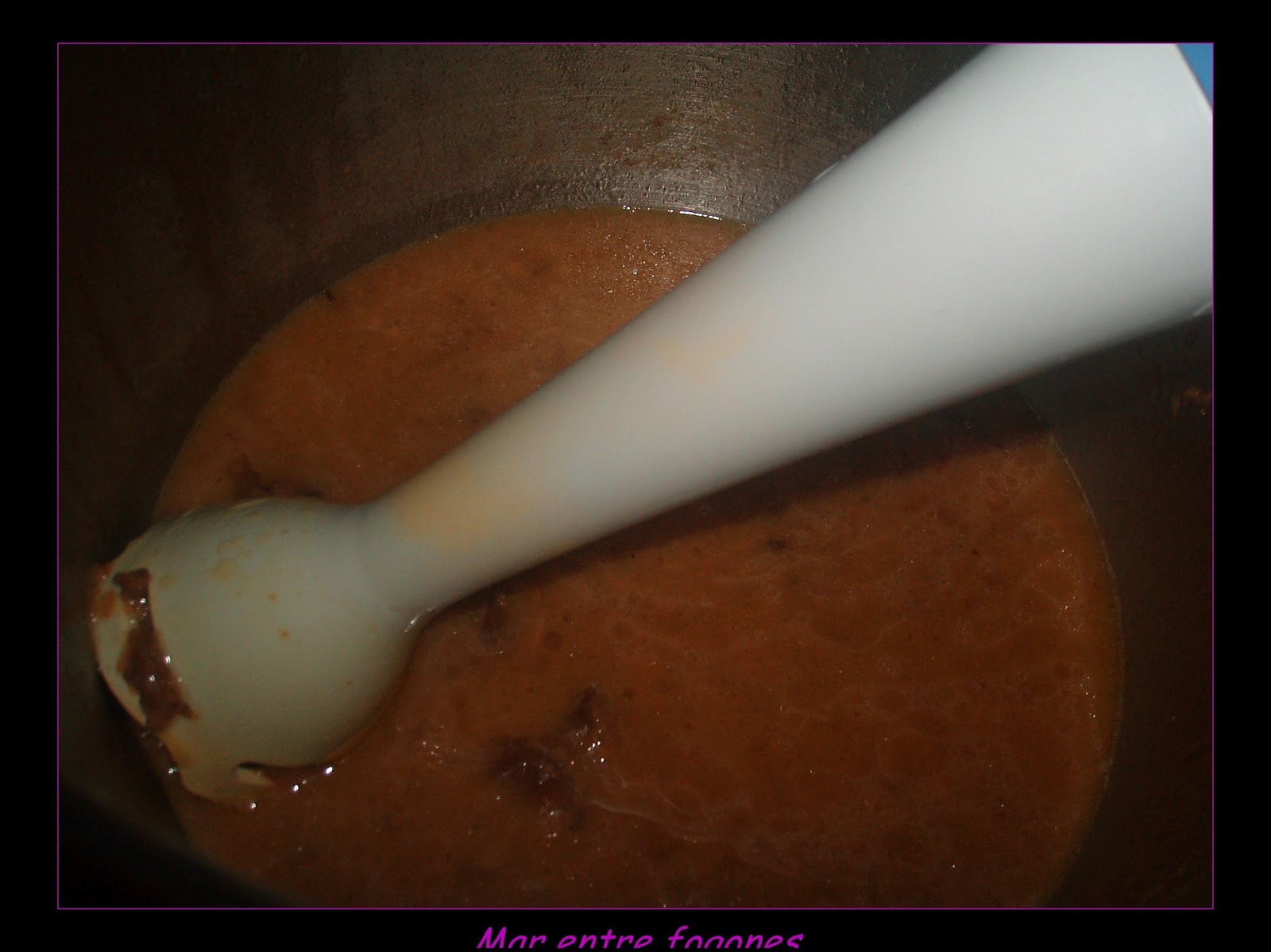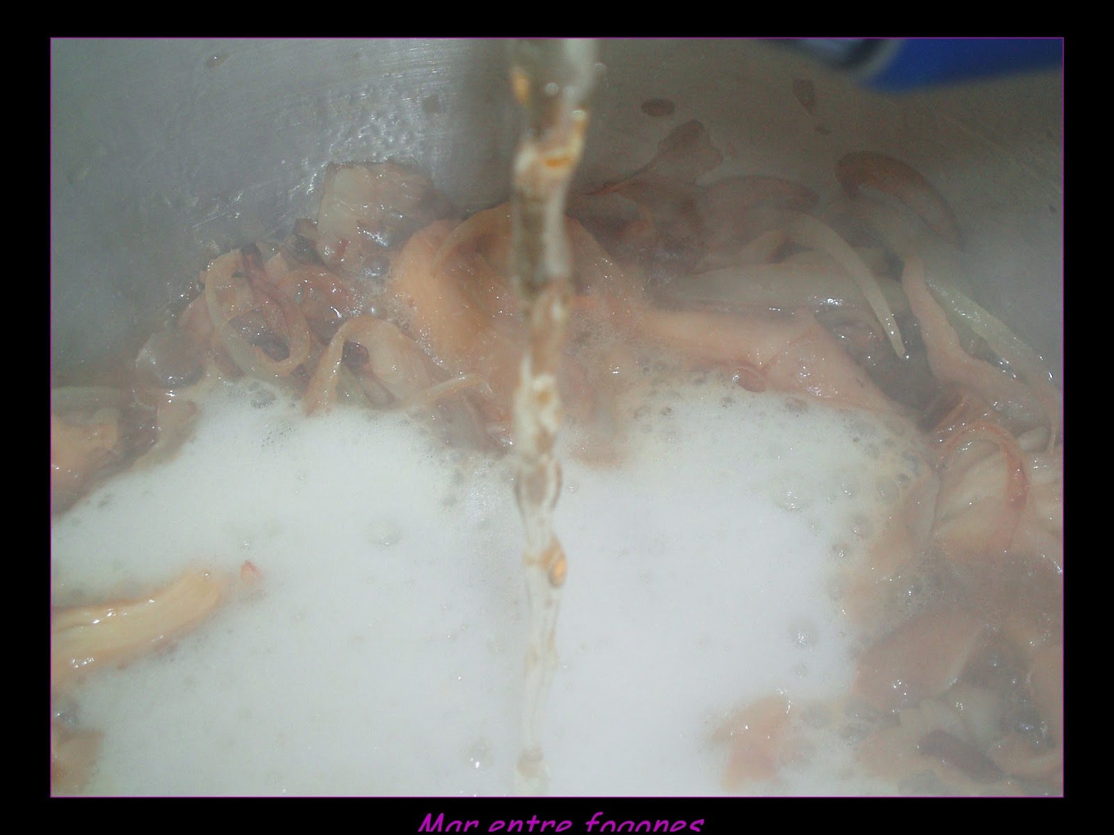 Dejamos hervir la salsa (sin añadir la carne ni los guisantes) y cuando está hirviendo echamos el agua fría con la Maizena.