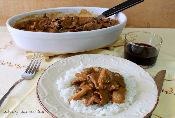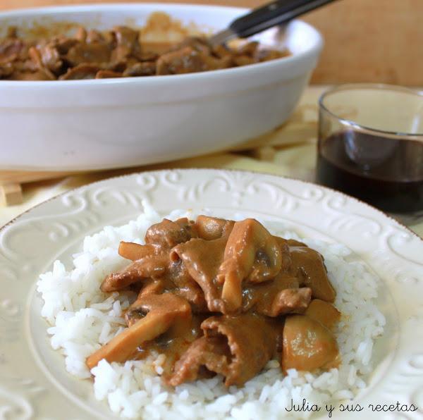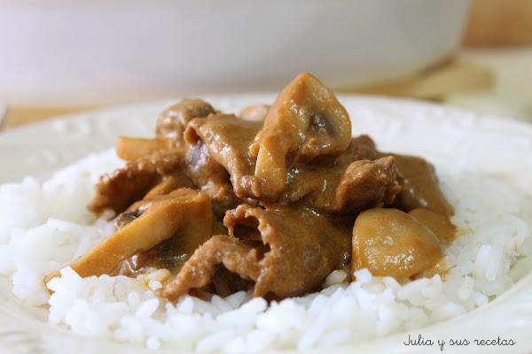 La ternera strogonoff, es una receta cuyos orígenes se remontan hasta finales del siglo XIX en Rusia. Consiste en trozos de ternera cocidos que se acompañan con champiñones, cebollas y una crema agria...servida sobre una cama de arroz o pasta.