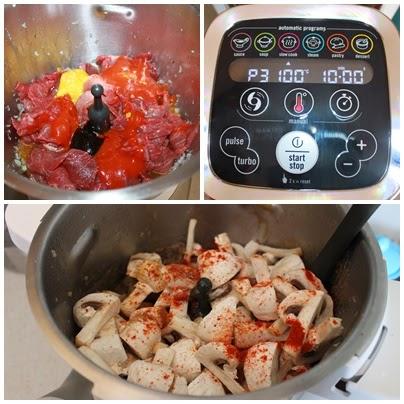 Añadimos los champiñones, el pimentón, pimienta al molida, sal y nuez moscada al gusto e iniciamos el programa de cocción lenta P3 a 100º C durante 15 minutos.