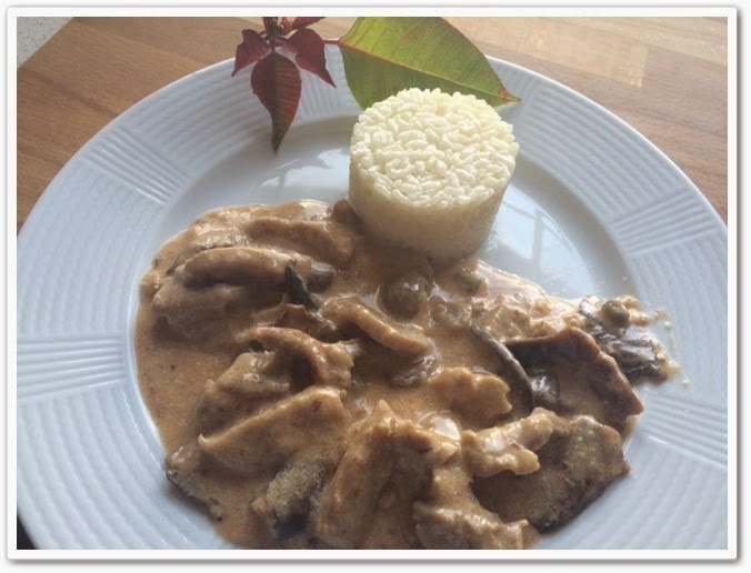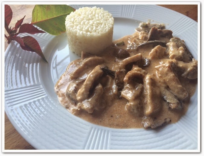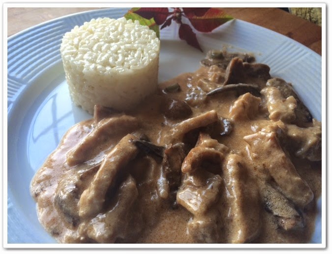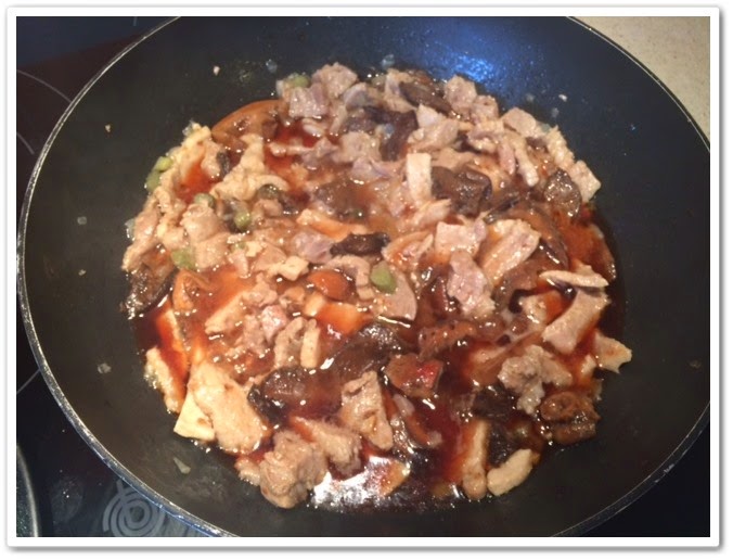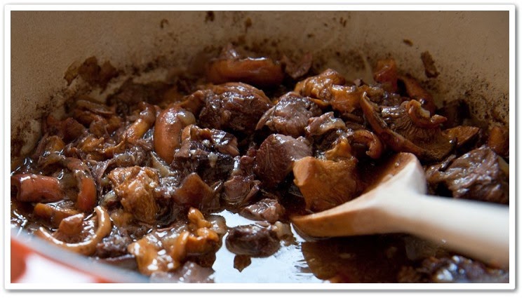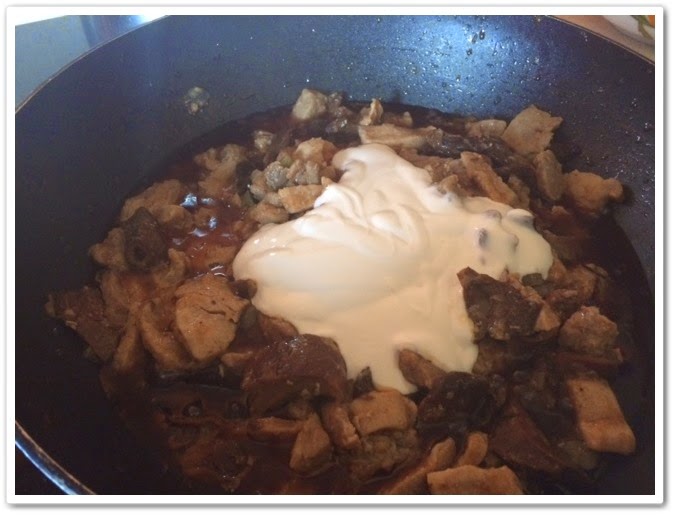 Cuando la carne se rehogo bien con la cebolla, flambear con el coñac y añadimos las setas con todo su caldo.