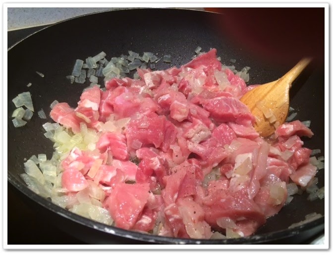 Cuando la cebolla este transparente y pochadita, añadimos la carne salpimentada.