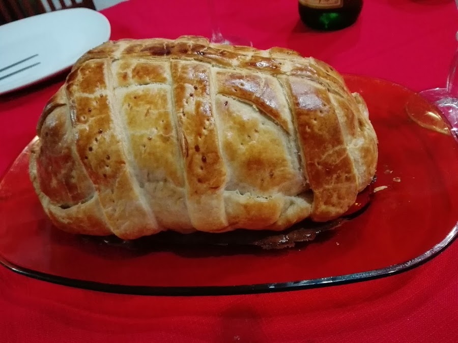 Estirar la masa de hojaldre, cubrir con el paté y las setas con cebolla, emvolver la carne, con la ayuda de film, quedando la apertura hacia abajo para que no se abra. Cerrando bien los lados y cortando el hojaldre sobrante. Cubrir con film y enrollar bien presionando los extremos, guardar en la nevera un mínimo de 30 minutos.