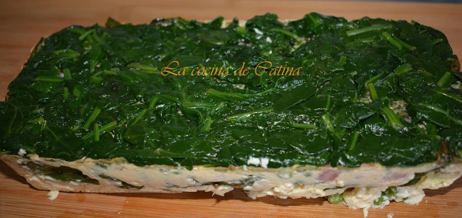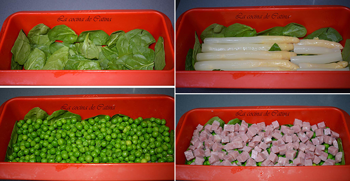 En una fuente de horno, ponemos agua y la ponemos en la guía inferior del horno. Pintamos el molde con aceite y lo cubrimos con las hojas de espinacas. Vamos poniendo capas alternativas en el molde, los espárragos, los guisantes y los daditos de jamón.