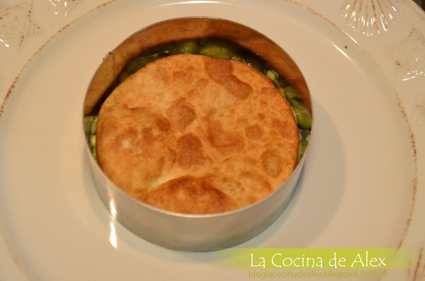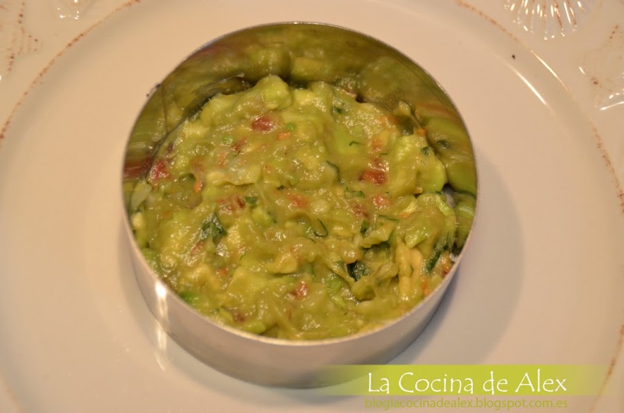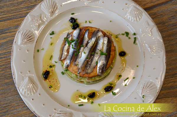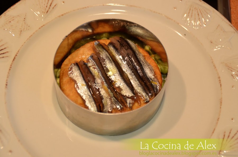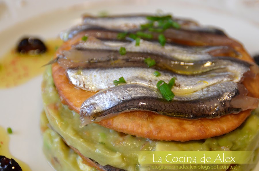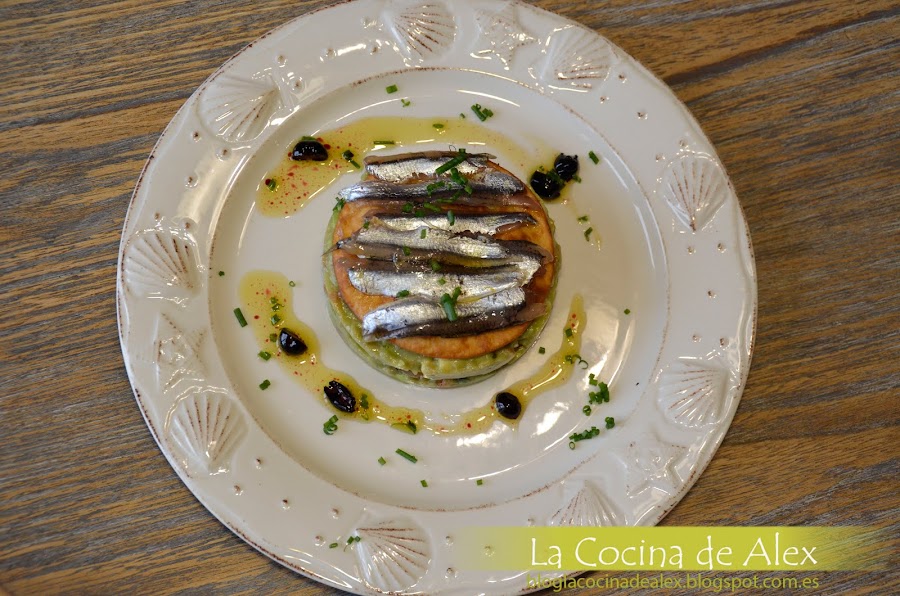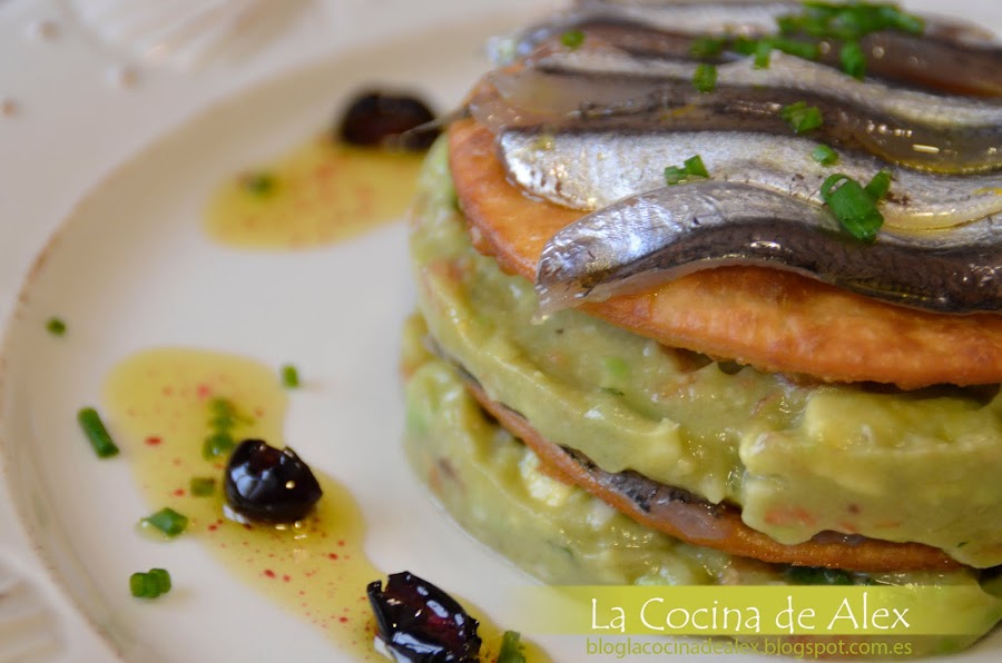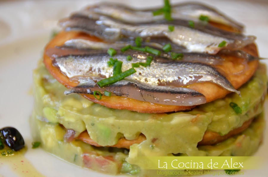 Ya tenemos todos los ingredientes de nuestra terrina, solo queda montar el plato por capas. Ponemos el molde en el plato, en el fondo del molde ponemos una capa de guacamole, una tortita de maíz y finalmente 4 boquerones que hemos marinado. Repetimos estas capas hasta que tengamos dos capasa de cada una.
