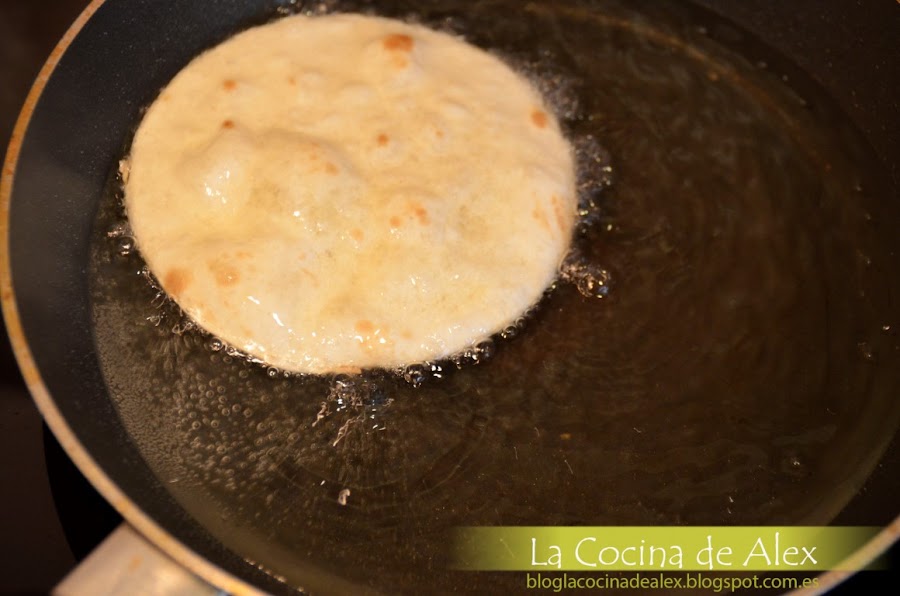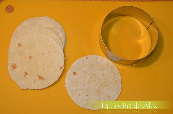 Ahora con la ayuda de un cortapastas o un molde que posteriormente usaremos para emplatar, cortamos las tortitas de maíz y las freímos en aceite a temperatura media hasta que estén doradas por los dos lados. Reservamos sobre papel absorbente para que quite el exceso de grasa.