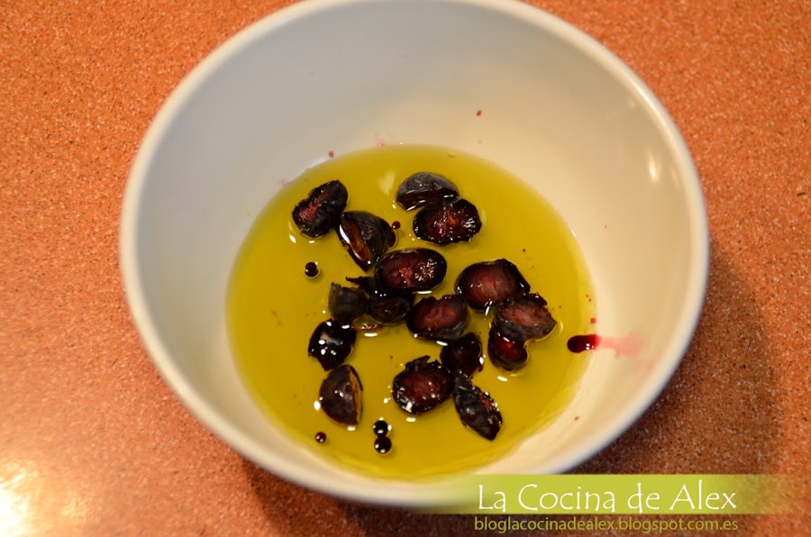 Para la vinagreta, en un recipiente cortamos los arándanos, ponemos aceite y sal y removemos un poco para mezclar todos los ingredientes.