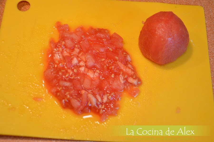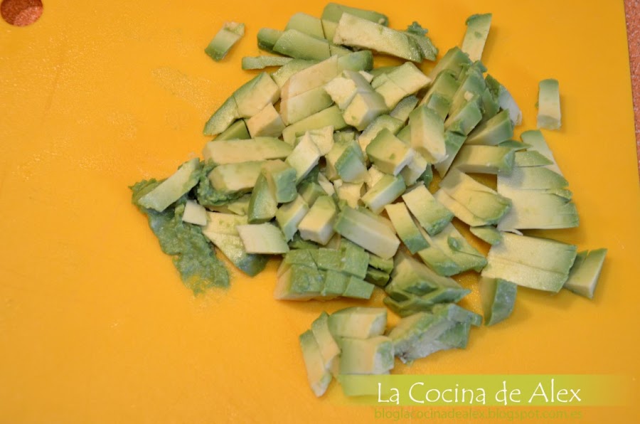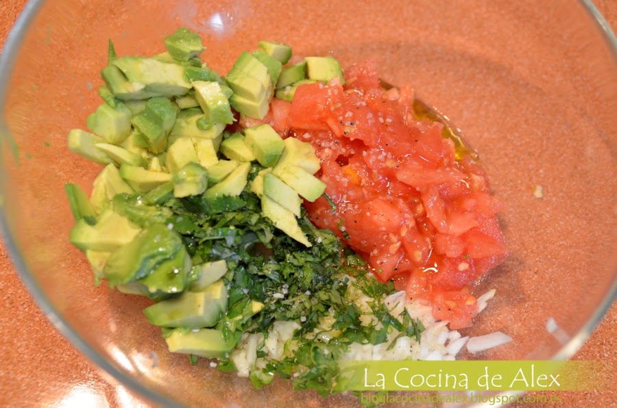 Para hacer el guacamole, picamos la cebolleta, el aguacate, el tomate previamente pelado, y el cilantro.