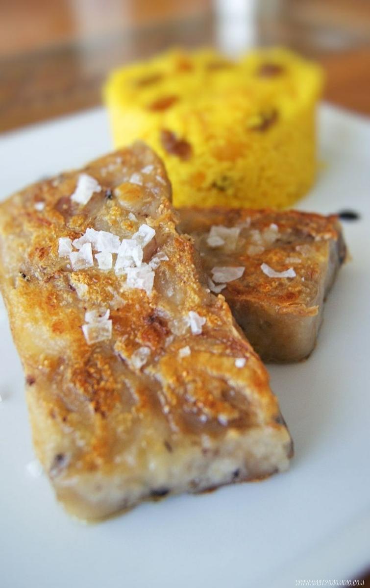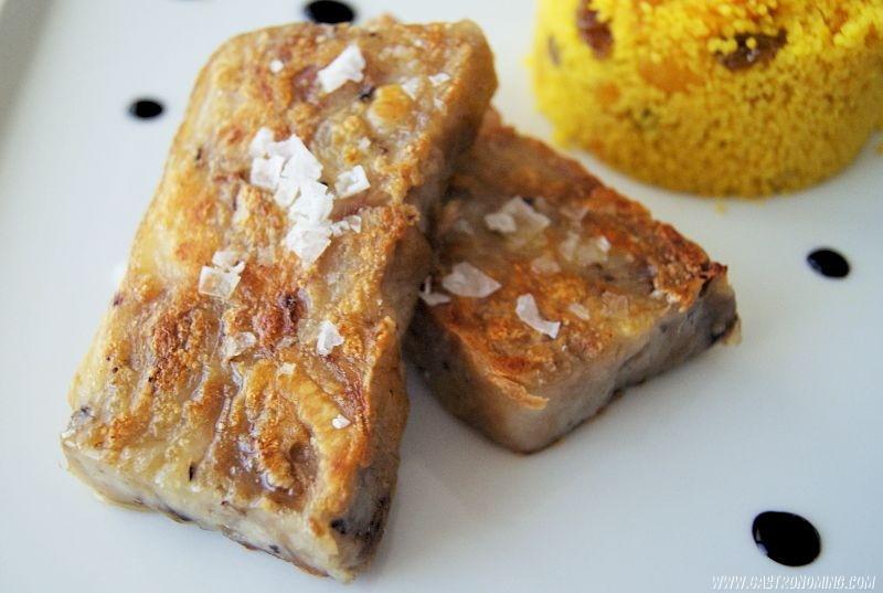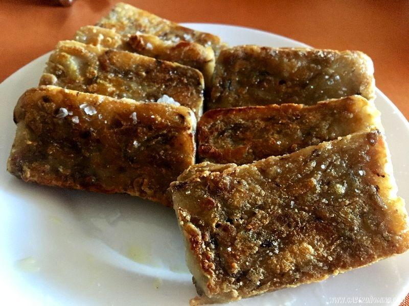 10. Cortamos raciones del grosor de un dedo y las vamos friendo por todos sus lados con gotas de aceite de oliva virgen extra que iremos añadiendo según vamos friendo por los distintos lados de nuestros “lingotes” de manitas. Servimos inmediatamente echando unas gotas de aceite de oliva virgen extra por encima y una escamas de sal.