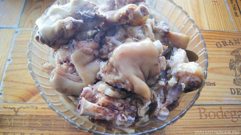 4. Cumplido el tiempo de cocción, enfriamos si vamos a guardar para comer otro día, de lo contrario desechamos las hojas de laurel, clavos con trozos de cebolla incluidos y los ajos. Retiramos las manitas y las deshuesamos (es mucho más fácil con las manitas aún calientes) dejando los huesos en un lado y la carne en un bol amplio con el caldo.