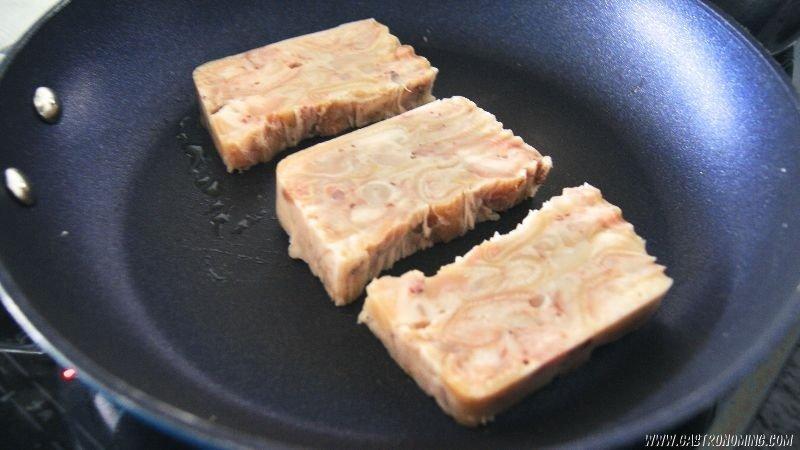 Cortamos raciones del grosor de un dedo y las vamos friendo por todos sus lados con gotas de aceite de oliva virgen extra que iremos añadiendo según vamos friendo por los distintos lados de nuestros “lingotes” de manitas. Servimos inmediatamente echando unas gotas de aceite de oliva virgen extra por encima y una escamas de sal.
