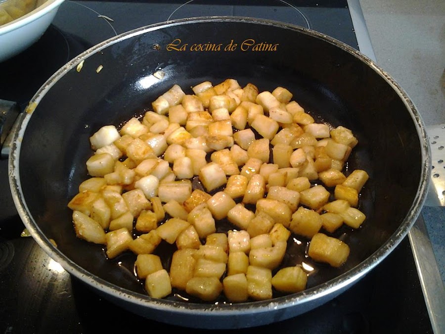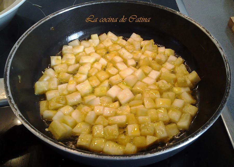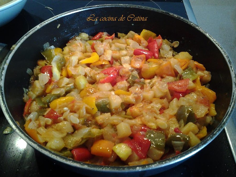 En otra sartén aparte freímos primero los dados de berenjena, cuando están fritos los pasamos a la sartén donde tenemos los pimientos y la cebolla. Hacemos lo mismo con el calabacín y el tomate.