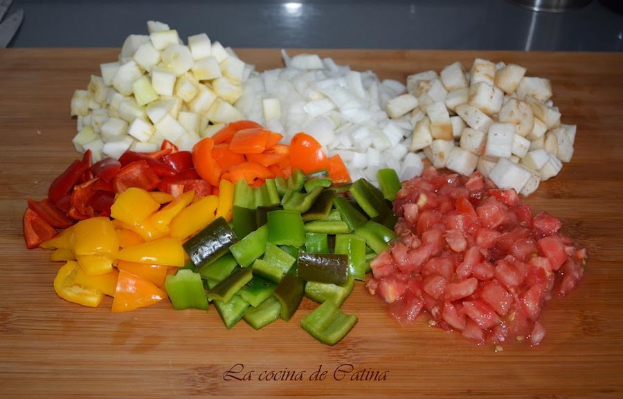 Pelamos los tomates, les quitamos las semillas y los cortamos en dados. Lavamos el resto de las hortalizas y las cortamos en daditos.