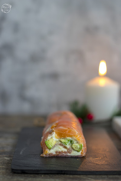 Untamos por encima la crema de queso, dejando los extremos libres. Pelamos el aguacate y cortamos en tiras, añadimos un poco de zumo de limón para que no se oxide y disponemos en el centro. Vamos enrollando todo con la ayuda del papel film, dándole forma cilíndrica. Cerramos bien. Y cubrimos con papel de aluminio para poder presionar bien el rulo y que quede compacto por dentro. Cerramos el papel de aluminio como de un caramelo se tratara y llevamos al frigorífico durante dos o tres horas, hasta que se compacte todo bien.