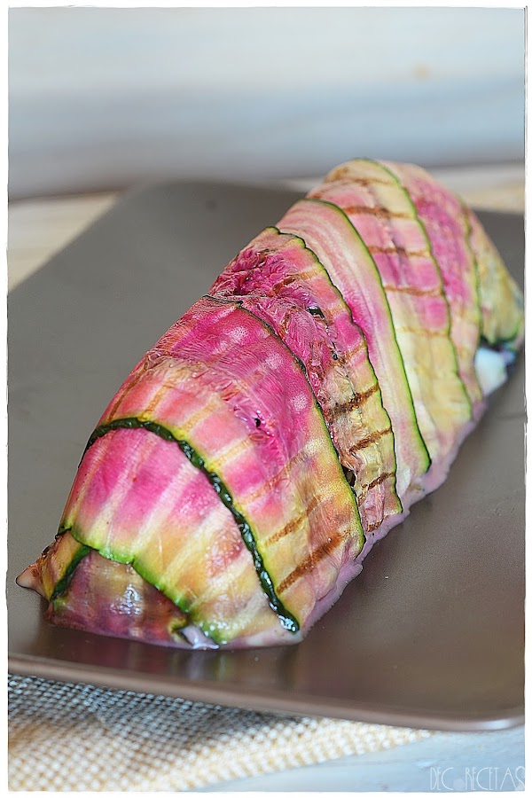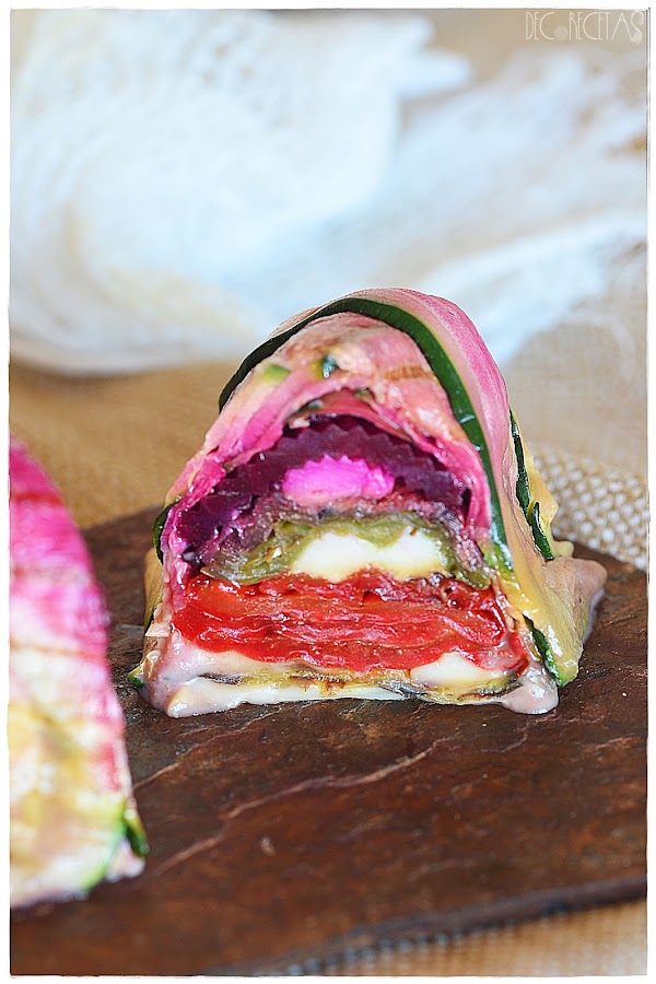 Primero pondremos una capa de láminas de calabacín, dejando parte de las tiras por fuera para poder cerrar el paquete finalmente. A continuación pondremos una capa de remolacha, una capa de queso, capa de pimiento rojo y verde, capa de queso, capa de berenjena, y finalmente cerramos con las tiras de calabacín que quedaban por fuera.
