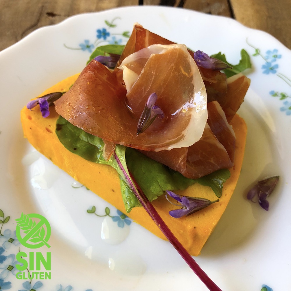 Zapallo Cabutia 1 u (zapallo cocido 500 gr), ricotta 400 gr, huevos 4 u, harina de arroz 100 gr, sal c/n y pimienta c/n. jamón crudo y mix de verdes para acompañar.