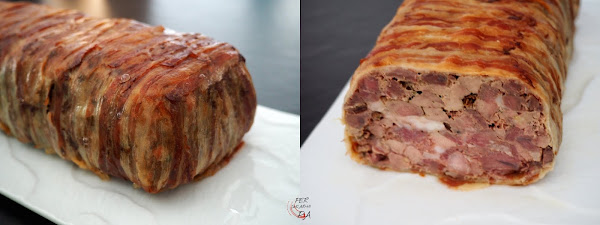 Forrar la terrina o el molde donde vayamos a cocinarla con finas tiras de bacon, de manera que sobresalgan por todos los bordes y podamos después cerrar el relleno.