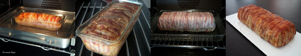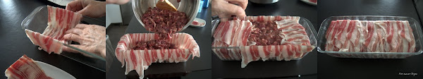 Colocar en el interior la mezcla de carne aderezada, nivelarla y entrecruzar las tiras de bacon hasta envolver por completo el relleno.