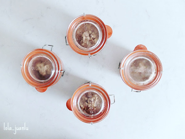 Una vez los tarros y tapas estén bien secos, los llenamos con nuestro preparado. Presionamos con un tenedor para eliminar el aire que pueda haber. Cerramos bien los tarros y los colocamos en una olla.