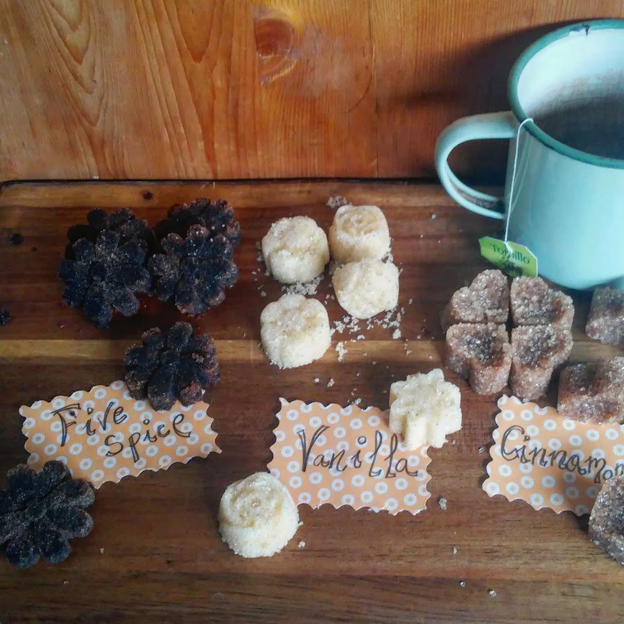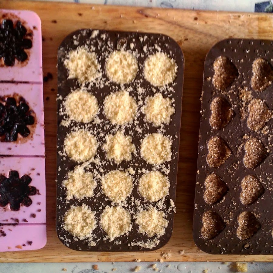 Llenamos moldes de silicona con los azúcares y llevamos cada uno de ellos, por separado, 30 segundos al microondas. Esperamos 10 -15 minutos y desmoldamos.