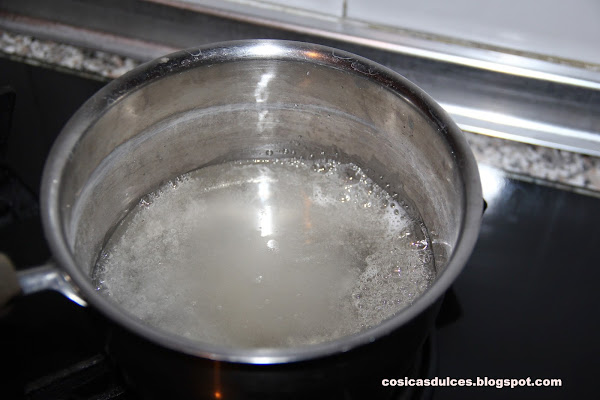 Comenzamos entonces a preparar el merengue. Para ello colocamos en un cazo los 250 gramos de agua junto a los 300 de azúcar y dejamos que se haga un almíbar a punto de bola o, si tenemos térmometro, alcance los 120 grados.. No debemos remover en ningún momento.