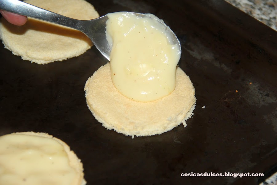 En ese punto podemos comenzar el montaje de nuestras tetas de vaca. Colocamos un disco de bizcocho y sobre él una cucharada de crema.