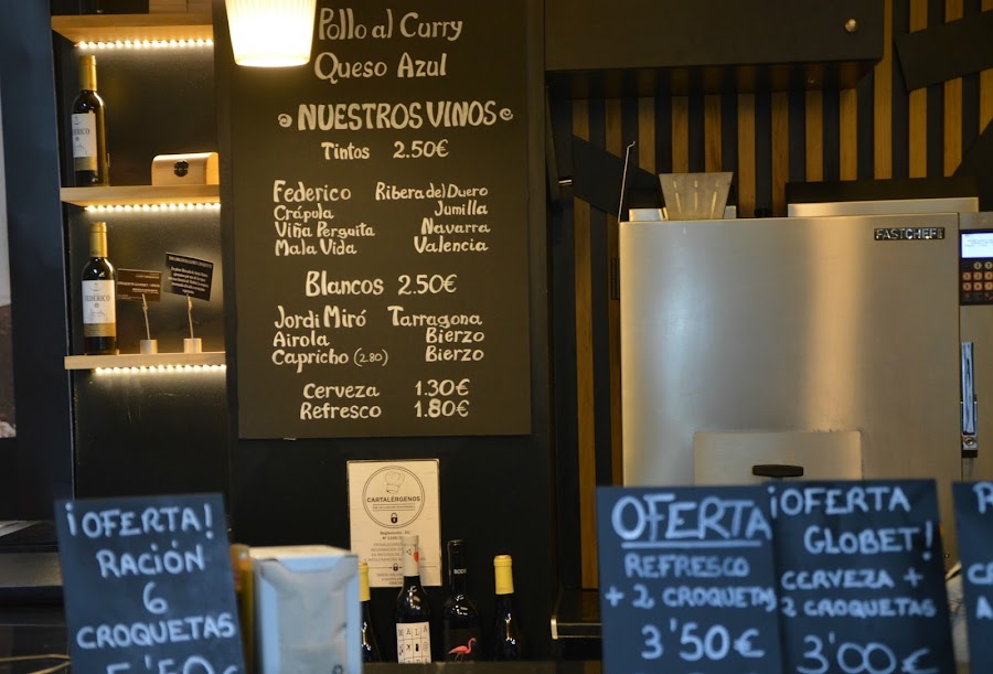 Nada más llegar, nos encontramos con un mostrador en donde se pueden ver los diferentes tipos de croquetas que ofrecen. Los rellenos son de lo más variado: desde la clásica croqueta de jamón, hasta la más atrevida de pollo al curry.