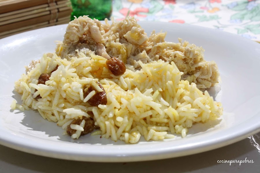 En una sartén ponemos el ajo picado con el aceite y la sal, una vez toma color el ajo agregamos las pasas el arroz , curry y el agua, dejamos 20 minutos al fuego.