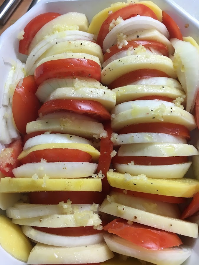 Se puede hacer un tian de cualquier verdura mediterránea: calabacín, berenjenas, nabo... con o sin queso e incluso se puede hacer con frutas. Lo que no debe faltar es el gratinado en el horno. Yo elegí las patatas pues trajo la tía Paula, de Fariza de Sayago, en Zamora unas patatas de su huerta maravillosas.