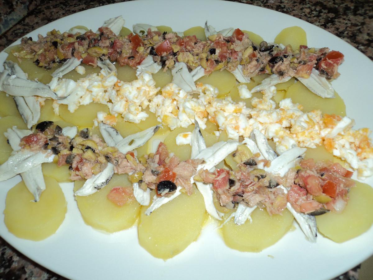Vinagreta con aceitunas negras y verdes, tomate y atúnTruco: si se cuecen las patatas con la piel, quedan mucho más sabrosas.