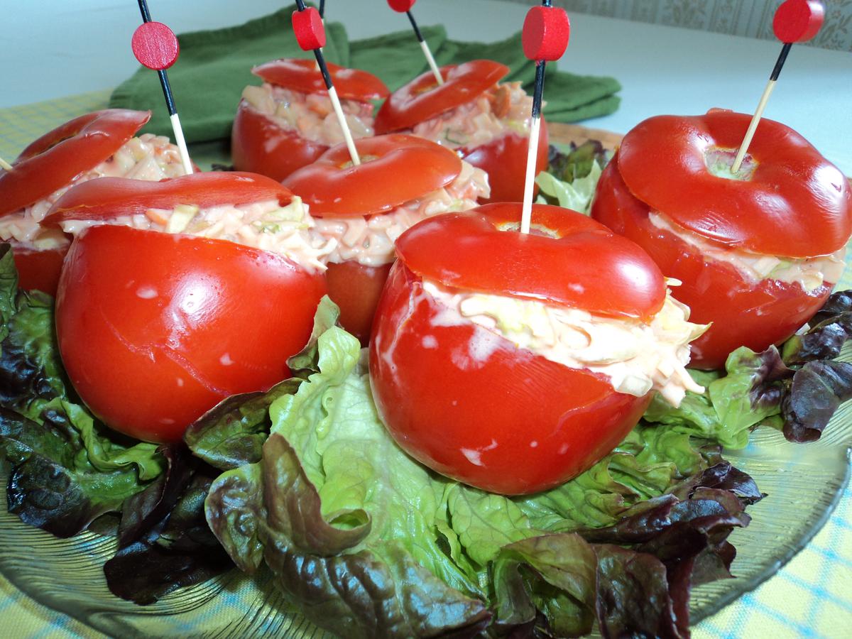 Tomates rellenos de lechuga, surimi y mayonesa
