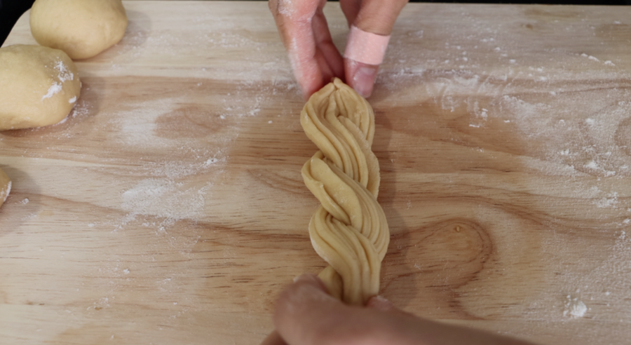 2. Agregue la harina y levadura en polvo. Amasar la masa. Divide la masa en 12 piezas.