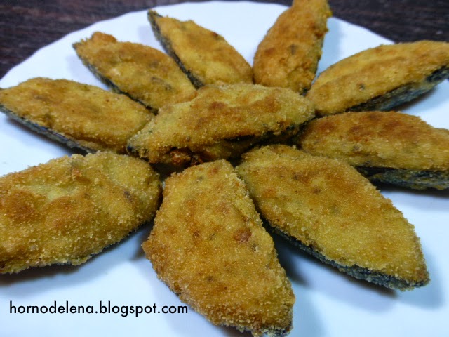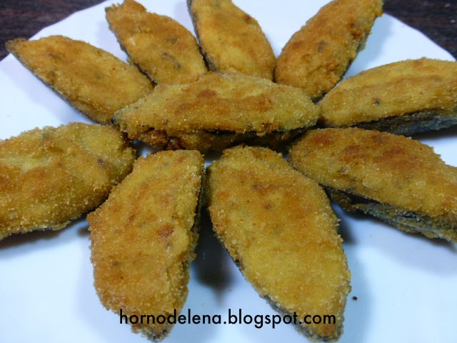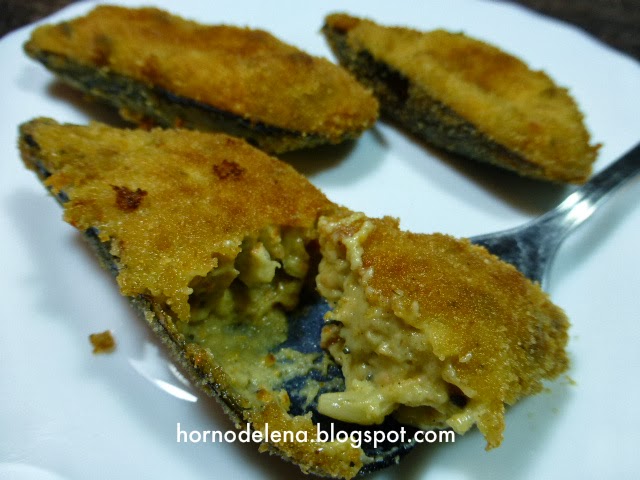 Rellenamos las cáscaras de los mejillones, las pasamos por los huevos batidos, luego por el pan rallado y por último los freímos (masa abajo) en aceite de oliva a fuego medio.