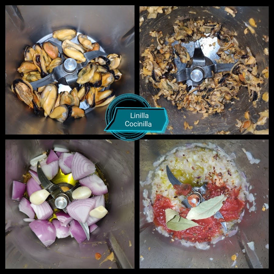 2. Ponga en el vaso los cuerpos de los mejillones y trocee 4 seg/ vel 4. Retire y reserve.