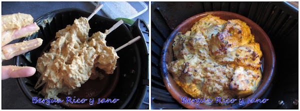 3. Embadurnamos el pollo bien con la salsa de marinado y lo ponemos a cocinar. Tradicionalmente sería en un horno tandoori, pero en casa podemos hacerlo en el horno a 200º durante unos 20 minutos (gíralos hacia la mitad del tiempo) o en la freidora de aire. Yo los puse en la broncheta y me di cuenta de que tenía el horno ocupado, así que tuve que hacerlos en un recipiente de barro en mi freidora de aire.