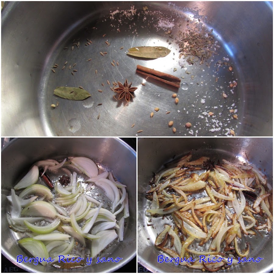 4. Mientras tanto, pasamos a la salsa masala: Echamos las especias a la sartén, después el aceite y, cuando esté caliente, la cebolla en juliana gruesa. Cocinamos durante unos 10 minutos, movemos de vez en cuando.