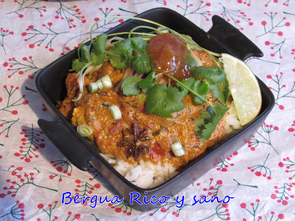 8. Ya solo queda servir. Si lo queremos con arroz, servimos arroz basmati hervido en la base de un cuenco o plato, entonces servimos el pollo con la salsa y completamos con cilantro fresco al gusto, varillas finas de jengibre fresco, cebolla morada en juliana, cebolleta en aritos, salsa de yogur de menta y una buena cucharada de chutney de mango. Yo además asé tiras de pimiento de guarnición.