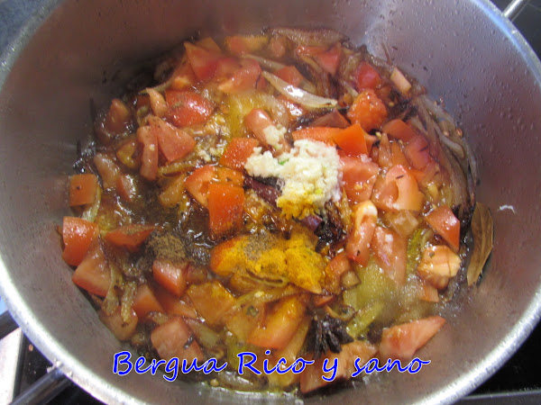 5. Añadimos los tomates cortados en dados, freímos mientras removemos y echamos una cucharadita de pasta de jengibre y ajo, o jengibre chafado y ajo prensado. Después añadimos la sal, la cúrcuma, el garam masala, el azúcar, guindilla al gusto y mezclamos.