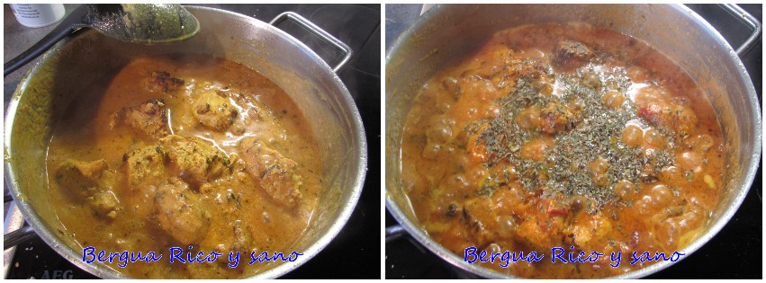 7. Introducimos nuestros trozos de pollo, los mezclamos con la salsa y lo dejamos un poco al fuego para que se integren los sabores. Empezaremos a notar la grasa del yogur y el aceite en la superficie, eso quiere decir que casi está; es el momento de escurrirle media lima por encima y, para hacerlo más cremoso, Abdul añade nata (crema de leche), pero eso ya a gusto de cada uno; yo prefiero poner más yogur y no añadir nata (crema de leche). Por último añadimos un buen pellizco de hojas de fenogreco y mezclamos bien.