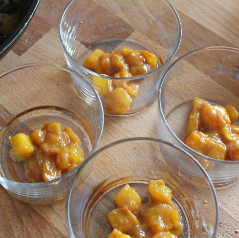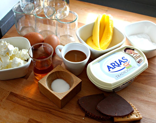 Distribuimos los datos de mango escurridos en el fondo de los vasos, cubrimos con la crema de dulce de leche. Sellamos con film transparente y dejamos reposar al menos 12 horas en el frigorífico.