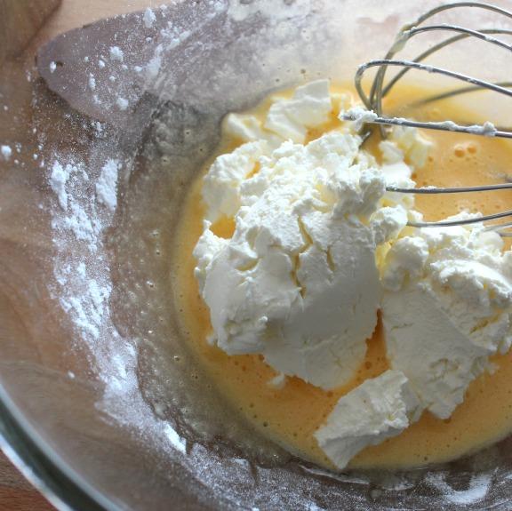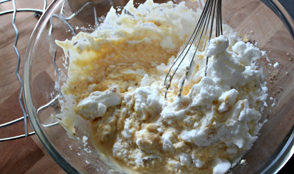 Vamos añadiendo las claras a las yemas con cuidado, mezclando de abajo a arriba.