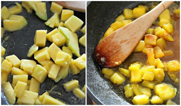 Pelamos el mango y lo picamos en dados. En una sartén lo salteamos con la mantequilla, 3-4 minutos. Añadimos media cucharada de dulce leche y el Amaretto.