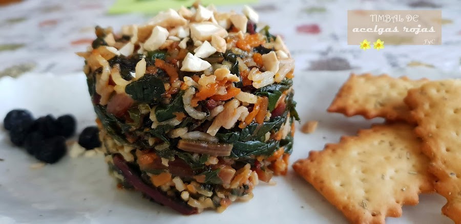 1 manojo de acelgas rojas, 3 zanahorias, 2 ajos, 1 cebolla dulce o 1/2 si es grande, 3 tacitas de café (suelo poner a ojo) de arroz basmati cocido (yo tengo siempre en el congelador), un puñado de pasas, sal, AOVE y anacardo picado para decorar.