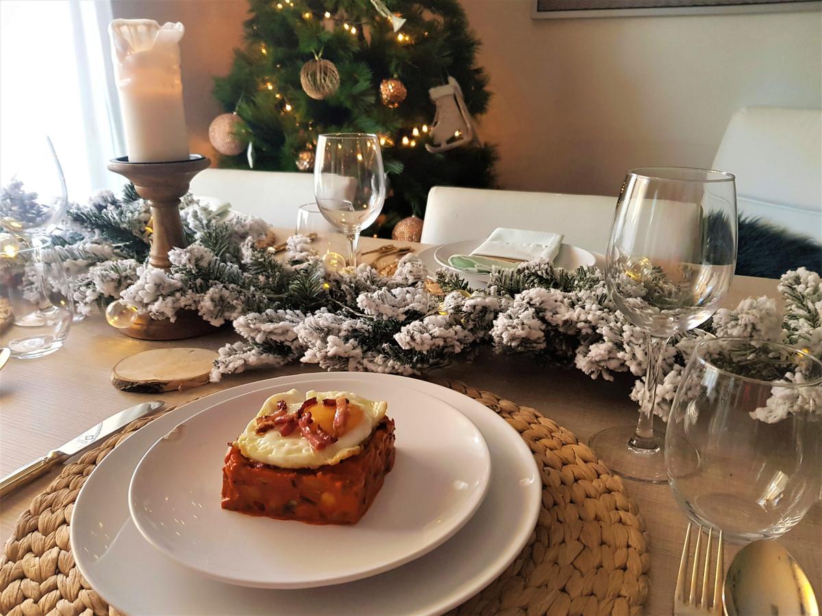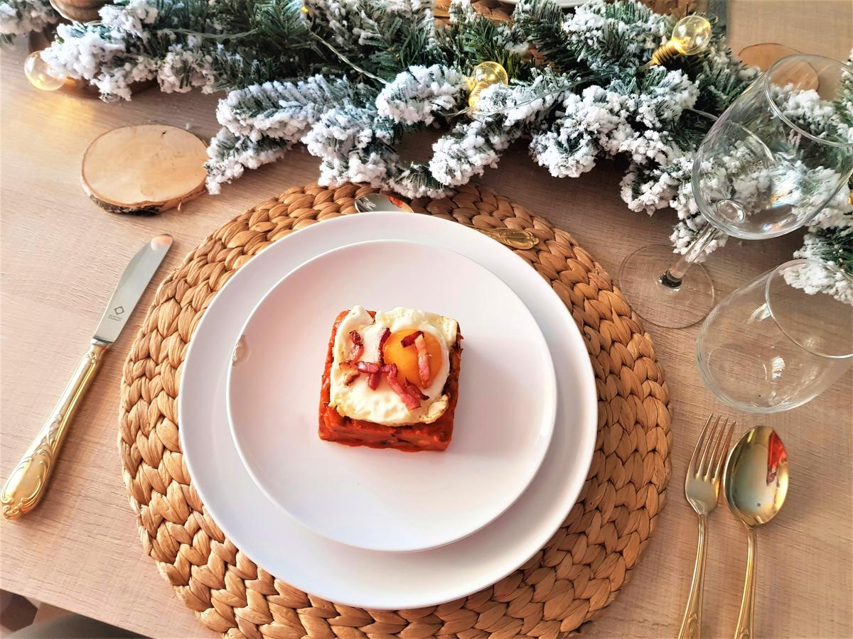 Colocamos el huevo encima del timbal y añadimos unos trocitos de jamón. El jamón lo podéis poner en crudo o bien a la plancha para potenciar aún más el sabor.