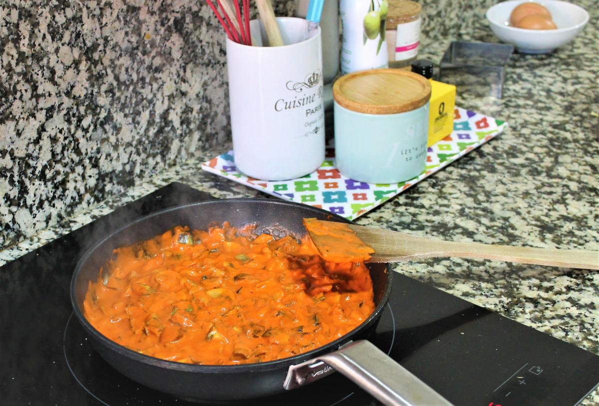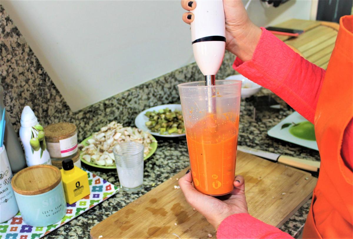 En este aceite añadimos todo el contenido del tarro de pimientos de piquillo incluido el jugo que lleva. Y dejamos a fuego medio durante 5 minutos. Una vez tenemos confitados los pimientos, lo pasamos al vaso de batidora y añadimos un chorrito de aceite (como una cuchara pequeña) y 100 gramos de nata (crema de leche). Y batimos bien.
