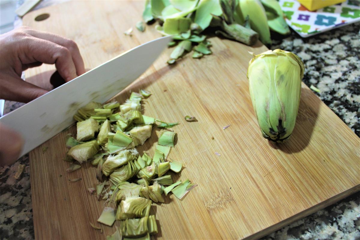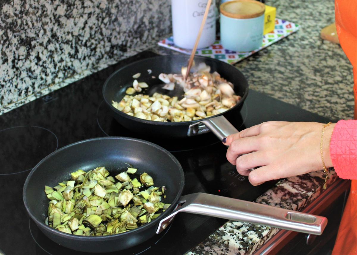 Mientras, pelamos las alcachofas y nos quedamos con el corazón. Ahora cortamos a trocitos esa alcachofa y lo ponemos en una sartén con un poquito de aceite a freir. Sazonamos.