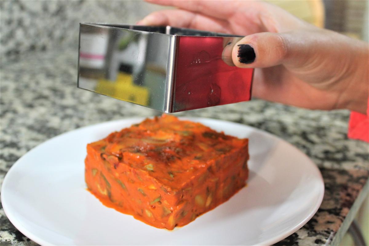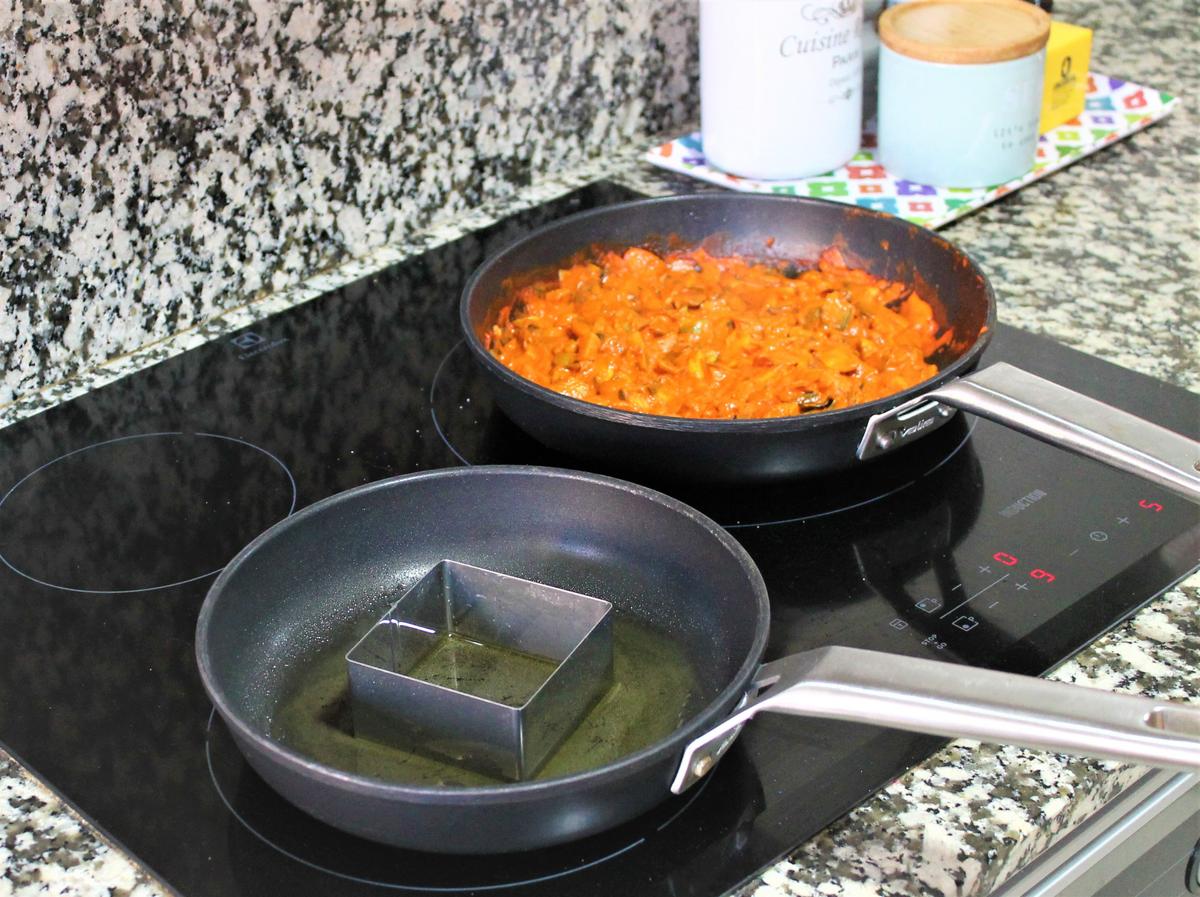 Una vez ambos ingredientes han cogido color y los vemos bien cocinados los unimos en una sola sartén y añadimos los pimientos que previamente habíamos triturado. Dejamos cocinando a fuego lento para que se vayan uniendo los sabores. Mientras, en una sartén con aceite de oliva colocamos el molde que vayamos a utilizar (yo he elegido este cuadrado, pero puede ser con la forma que prefieras) Con el aceite caliente, freímos el huevo. Retiramos, y limpiamos bien el molde. Una vez limpio, lo colocamos en un plato y lo llenamos con la mezcla que a estas alturas ya estará lista. Un consejo: apretar muy bien para que luego aguante bien al desmoldar.