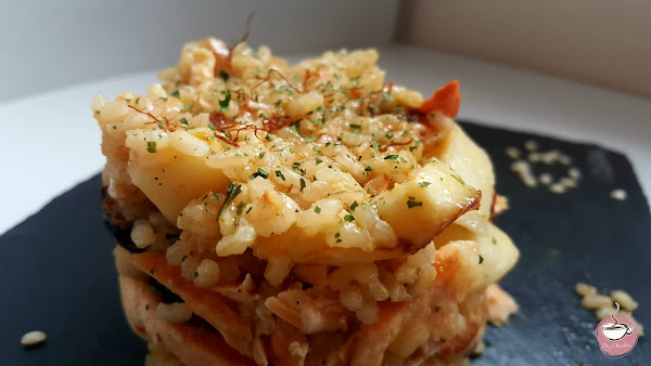 Añadimos unas hebras de azafrán. Cuando casi se haya consumido todo el caldo del fumet, echamos el salmón desmenuzado y los mejillones y dejamos que el arroz termine de hacerse y que el pescado se haga con el vapor de la cocción.